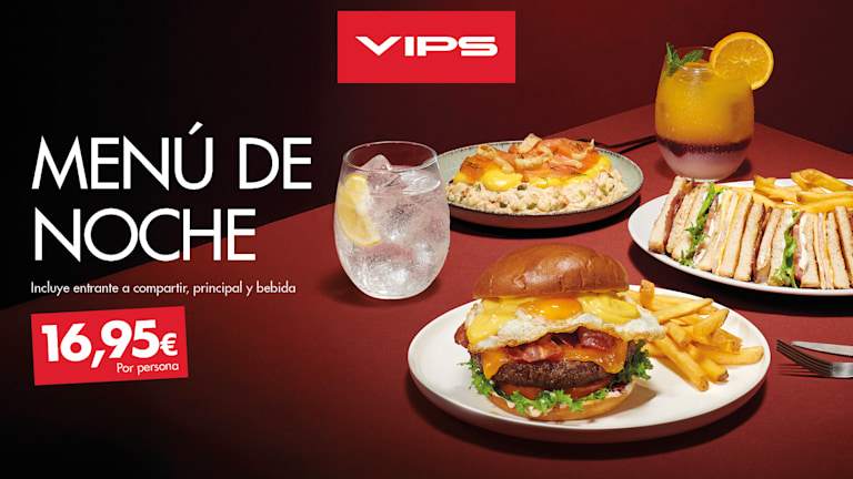 VIPS lanza su Menú de Noche, una deliciosa propuesta pensada para disfrutar. Por 16,95 € por persona, el menú incluye entrante a compartir, plato principal y bebida, ofreciendo una experiencia completa al mejor precio.