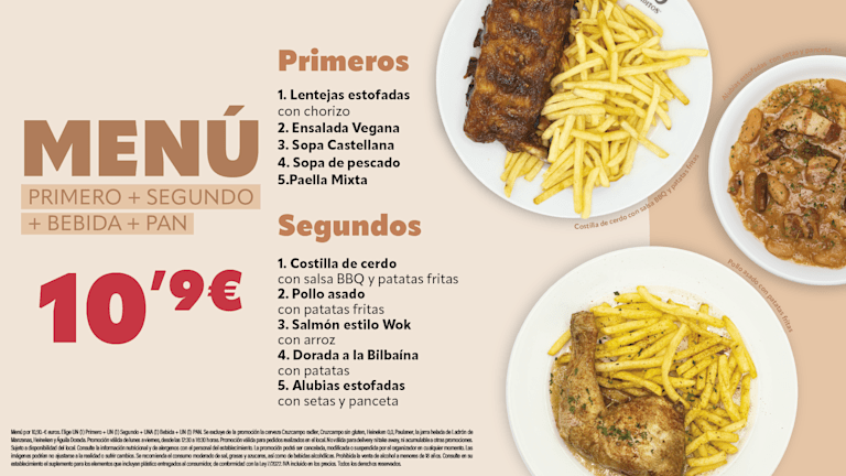 Disfruta de un menú completo y delicioso con primer plato + segundo + bebida + pan por tan solo 10,9€.